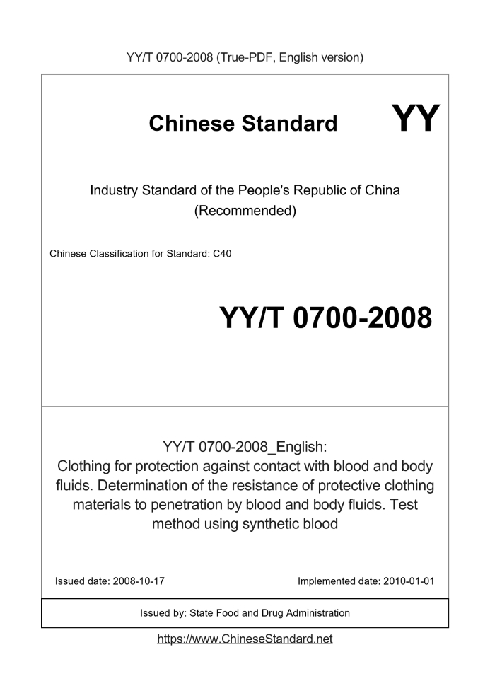 Delivery: <= 3 days. True-PDF full-copy in English will be manually translated and delivered via email. YY/T 0700-2008: Clothing for protection against contact with blood and body fluids. Determination of the resistance of protective clothing materials to penetration by blood and body fluids. Test method using synthetic blood Status: Valid