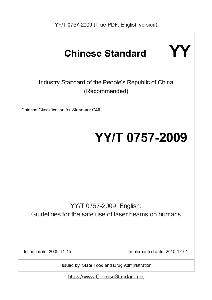 Delivery: <= 4 days. True-PDF full-copy in English will be manually translated and delivered via email. YY/T 0757-2009: Guidelines for the safe use of laser beams on humans Status: Valid