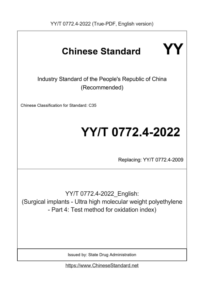 Delivery: <= 3 days. True-PDF full-copy in English will be manually translated and delivered via email. YY/T 0772.4-2022: (Surgical implants - Ultra high molecular weight polyethylene - Part 4: Test method for oxidation index) Status: Valid YY/T 0772.4: Historical versions