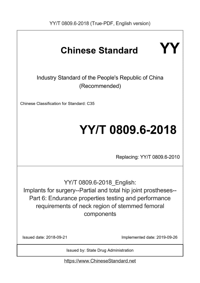 Delivery: <= 3 days. True-PDF full-copy in English will be manually translated and delivered via email. YY/T 0809.6-2018: Implants for surgery--Partial and total hip joint prostheses--Part 6: Endurance properties testing and performance requirements of neck region of stemmed femoral components Status: Valid YY/T 0809.6: Historical versions