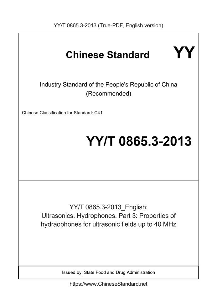 Basic dataStandard ID: YY/T 0865.3-2013 (YY/T0865.3-2013)Description (Translated English): Ultrasonics. Hydrophones. Part 3: Properties of hydraophones for ultrasonic fields up to 40 MHz Sector / Industry: Medical Device & Pharmaceutical Industry Standard (Recommended) Classification of Chinese Standard: C41 Classification of International Standard: 11.040.50 Word Count Estimation: 17,198 Quoted Standard: IEC 62127-1; IEC 62127-2 Adopted Standard: IEC 62127-3-2007, IDT Regulation (derived from): State Food and Drug Administration announcement 2013 No. 36; industry standard for filing Notice 2013 No. 12 (No. 168 overall) Issuing agency(ies): State Food and Drug Administration Summary: This standard specifies the characteristics of the relevant requirements of the hydrophone. This standard applies to: the use of a piezoelectric sensing element, designed for measuring ultrasonic pulse generated by the equipment and continuous wave ultras YY/T 0865.3-2013: Ultrasonics. Hydrophones. Part 3: Properties of hydraophones for ultrasonic fields up to 40 MHz---This is a DRAFT version for illustration, not a final translation. Full copy of true-PDF in English version (including equations, symbols, images, flow-chart, tables, and figures etc.) will be manually/carefully translated upon your order. Ultrasonics.Hydrophones.Part 3. Properties of hydraophones for ultrasonic fields up to 40 MHz ICS 11.040.50 C41 People's Republic of China pharmaceutical industry standards Ultrasonic hydrophone Part 3. 40MHz of ultrasonic field water hydrophone characteristics Part 3. Propertiesofhydrophonesforultrasonicfieldsupto40MHz (IEC 62127-3.2007, IDT) Issued on. 2013-10-21 2014-10-01 implementation China Food and Drug Administration released ForewordYY/T 0865 "ultrasonic hydrophone" is divided into three parts. --- Part 1. Measurement and the following features 40MHz medical ultrasound depicted; --- Part 2. 40MHz or less water ultrasound hydrophone calibration; Part --- Section 3. 40MHz or less water ultrasound hydrophone characteristics. This section YY/T Section 30865 of. This section drafted in accordance with GB/T 1.1-2009 given rules. This section is equivalent to using the International Electrotechnical Commission standard IEC 62127-3.2007 "ultrasonic hydrophone - Part 3. 40MHz or less Ultrasound hydrophone water features. " Correspondence between the consistency of the standards of international documents and normative references of the following documents. YY/T 0865.1-2011 ultrasonic hydrophone - Part 1. Measurement and characterization of medical ultrasonic fields of 40MHz or less portrayed (IEC 62127-1.2007, IDT) This part of IEC 62127-3.2007 only made a very small amount of editorial changes did not affect the degree of consistency. This part is proposed by the China Food and Drug Administration. This part of the standardization of medical ultrasound equipment for medical appliances National Standardization Technical Committee Technical Committee (SAC/TC10/SC2) Centralized. This section drafted by. State Food and Drug Administration of Hubei Medical Device Quality Supervision and Inspection Center. The main drafters of this section. Wang Zhijian, Jiang Shilin.IntroductionUsually miniature ultrasonic hydrophones measuring space and time ultrasonic liquid medium field sound pressure distribution, many of those involved in the IEC standard Hydrophone various aspects of the device characteristics. Objective YY/T 0865 of this section is. the sum of all these requirements, for hydrophone characteristics establish a Parts of common standards. The main application areas of this part of the hydrophone is. measuring ultrasonic fields in water by the medical diagnostic equipment emits. Other doctors Science application areas are. treatment equipment, such as crushed stone, high-intensity focused ultrasound (HIFU) and sound field measurements treatments. In non-medical applications, Hydrophone in product development and quality control and other aspects are also widely used, including. --- Ultrasonic cleaning tank super sound field depicted; --- In the emission measurement system, the use of the characteristics of the sound field rendering (for example, an ultrasonic spectrometer, ultrasonic attenuation meter and speedometer); --- In the reflection measurement system, used in depicting the characteristics of the sound field (for example, Doppler flow meter). At the same time, the term "hydrophone" more widely understood here relates to a miniature piezoelectric hydrophone. Currently this type of instrument, in Application of ultrasound in various fields, especially for quantitative medical diagnostic equipment sound field structure is depicted. Other types of pressure sensors, such as one based The principle of fiber, some of the requirements of this section apply, others do not apply. If in the future these other "hydrophone" type of sound field measurements Occupy a more important role in the revision of the standard or independent of this part will be related to their properties. Underwater acoustic hydrophone by the IEC 60500 and IEC 60565 covered, although there is overlap in the frequency range, but does not belong to this part of the Fan Domains. Underwater acoustic hydrophone for natural waters, even the ocean, which led to different technical concepts and requirements. In addition, the application of acoustic sound of water The main direction of the incident is generally perpendicular to the axis of acoustic hydrophone and assume in this section, which is located on the hydrophone axis. In the past, ultrasound hydrophones used almost exclusively amplitude sensor, the current situation has changed, even more attention to the use of their additional phase information, However, only during the calibration may be used to determine the phase characteristics when the hydrophone. Therefore, in this section, in addition to the provisions of the hydrophone Sensitivity margin requirements, but as an option, phase requ