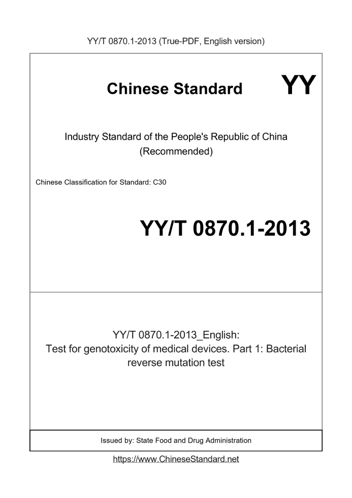 Delivery: <= 3 days. True-PDF full-copy in English will be manually translated and delivered via email. YY/T 0870.1-2013: Test for genotoxicity of medical devices. Part 1: Bacterial reverse mutation test Status: Valid