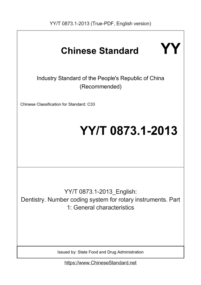 Delivery: <= 3 days. True-PDF full-copy in English will be manually translated and delivered via email. YY/T 0873.1-2013: Dentistry. Number coding system for rotary instruments. Part 1: General characteristics Status: Valid