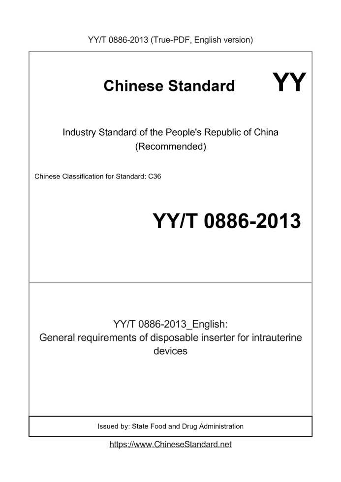 Delivery: <= 3 days. True-PDF full-copy in English will be manually translated and delivered via email. YY/T 0886-2013: General requirements of disposable inserter for intrauterine devices Status: Valid