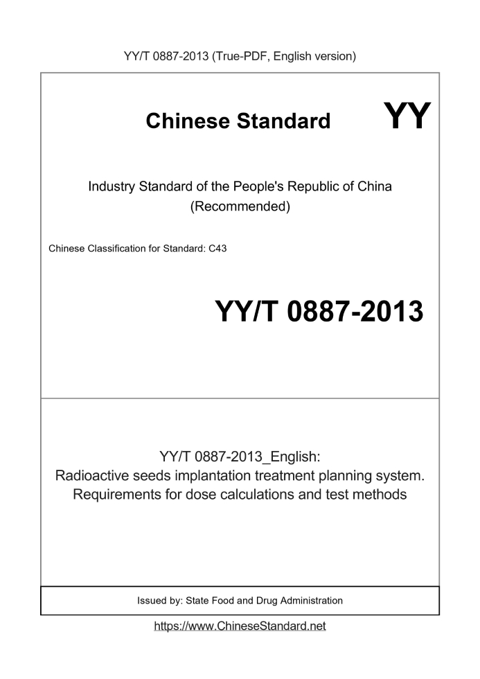 Delivery: <= 3 days. True-PDF full-copy in English will be manually translated and delivered via email. YY/T 0887-2013: Radioactive seeds implantation treatment planning system. Requirements for dose calculations and test methods Status: Valid