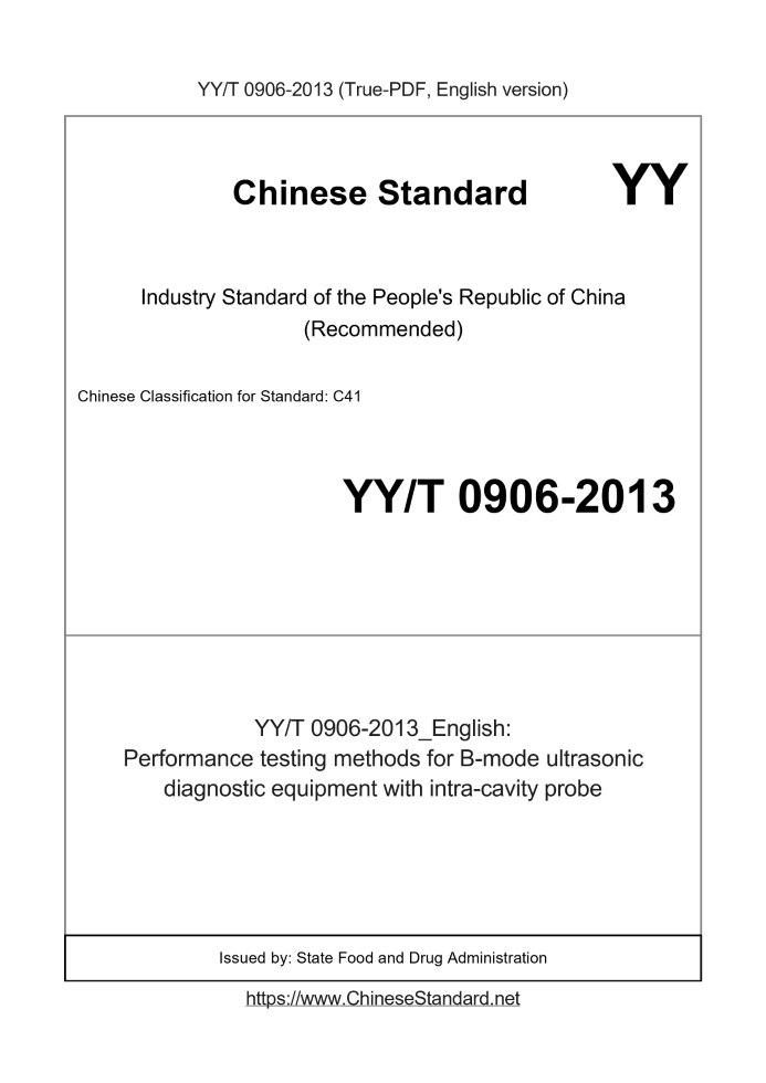 Delivery: <= 3 days. True-PDF full-copy in English will be manually translated and delivered via email. YY/T 0906-2013: Performance testing methods for B-mode ultrasonic diagnostic equipment with intra-cavity probe Status: Valid
