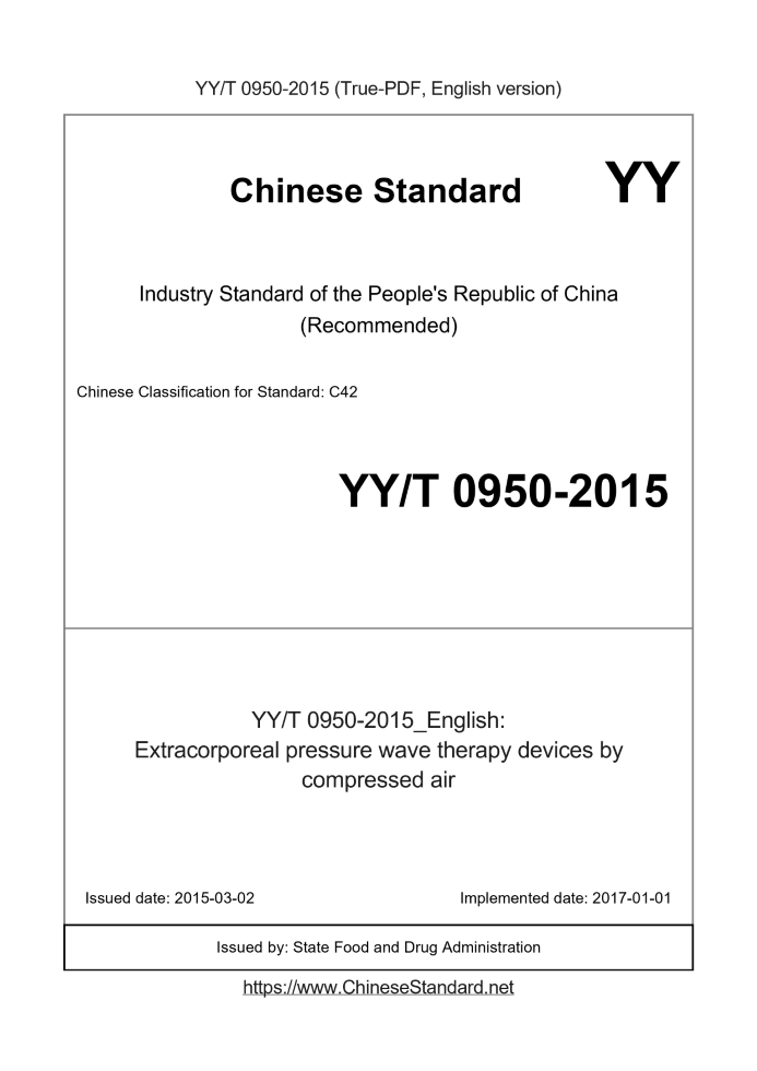 Delivery: <= 3 days. True-PDF full-copy in English will be manually translated and delivered via email. YY/T 0950-2015: Extracorporeal pressure wave therapy devices by compressed air Status: Valid YY/T 0950: Historical versions