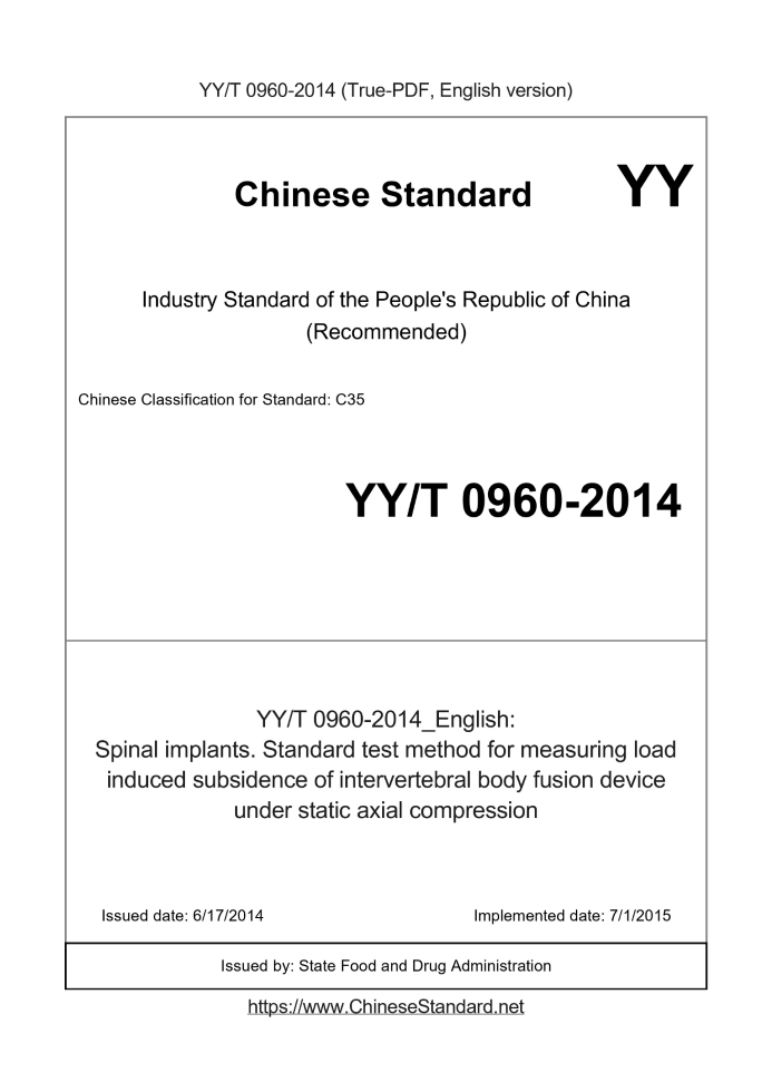 Delivery: <= 3 days. True-PDF full-copy in English will be manually translated and delivered via email. YY/T 0960-2014: Spinal implants. Standard test method for measuring load induced subsidence of intervertebral body fusion device under static axial compression Status: Valid