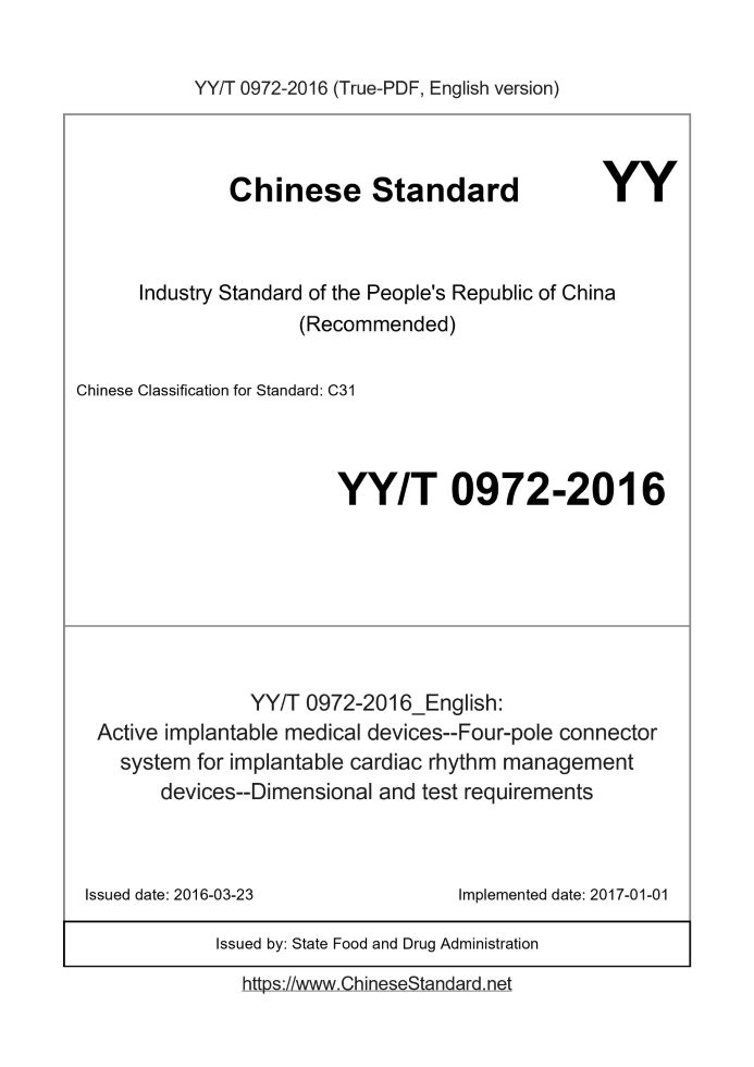 Delivery: <= 10 days. True-PDF full-copy in English will be manually translated and delivered via email. YY/T 0972-2016: Active implantable medical devices--Four-pole connector system for implantable cardiac rhythm management devices--Dimensional and test requirements Status: Valid