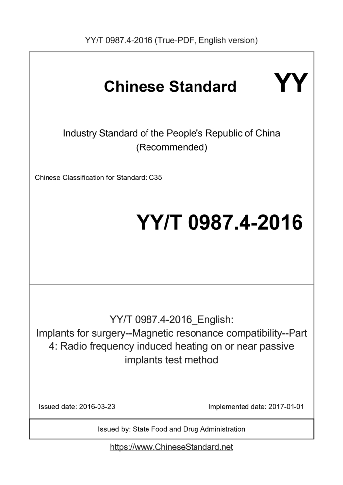 Delivery: <= 4 days. True-PDF full-copy in English will be manually translated and delivered via email. YY/T 0987.4-2016: Implants for surgery--Magnetic resonance compatibility--Part 4: Radio frequency induced heating on or near passive implants test method Status: Valid