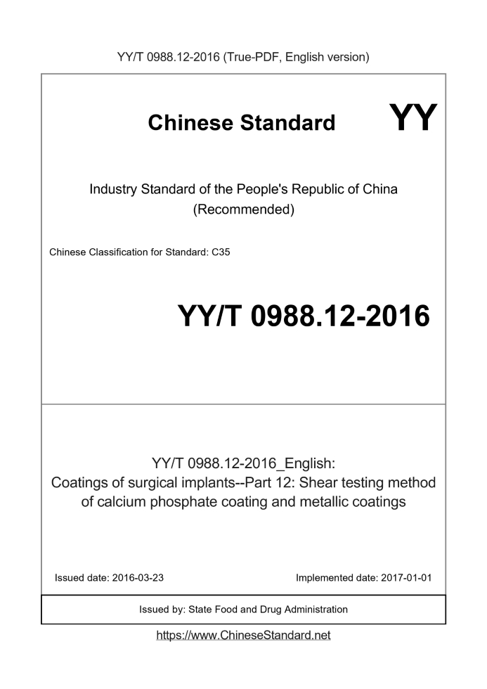 Delivery: <= 3 days. True-PDF full-copy in English will be manually translated and delivered via email. YY/T 0988.12-2016: Coatings of surgical implants--Part 12: Shear testing method of calcium phosphate coating and metallic coatings Status: Valid