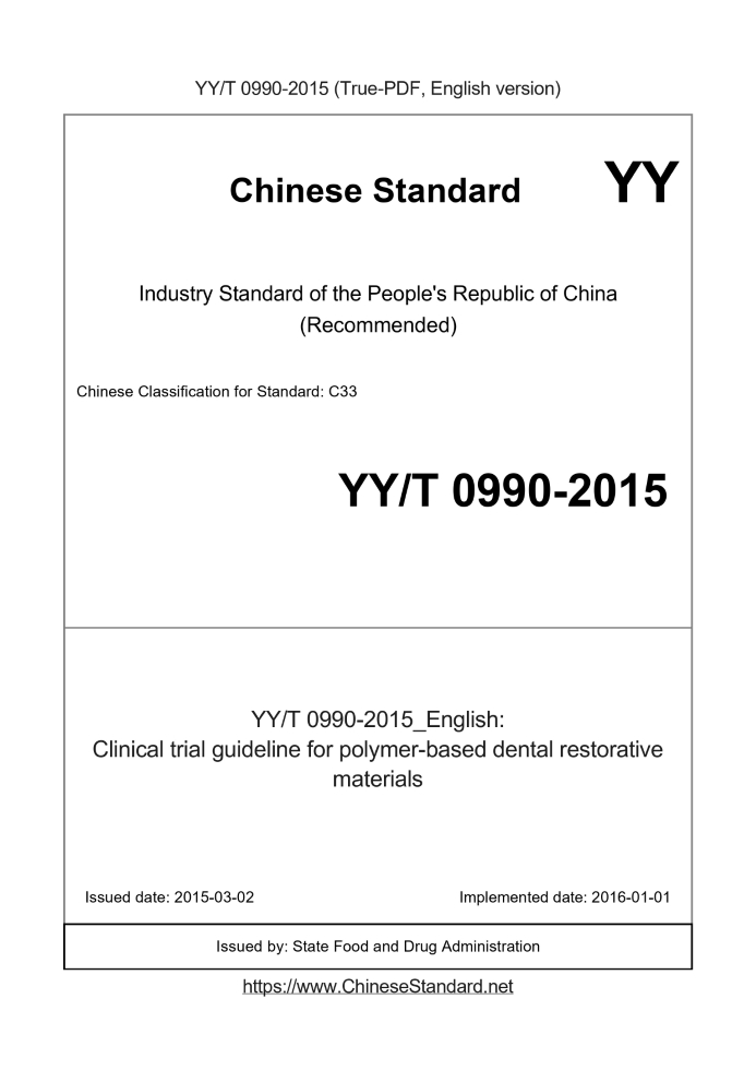 Delivery: <= 3 days. True-PDF full-copy in English will be manually translated and delivered via email. YY/T 0990-2015: Clinical trial guideline for polymer-based dental restorative materials Status: Valid