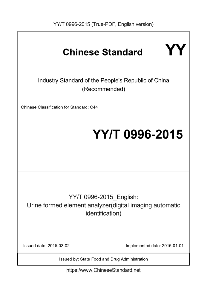 Delivery: <= 3 days. True-PDF full-copy in English will be manually translated and delivered via email. YY/T 0996-2015: Urine formed element analyzer(digital imaging automatic identification) Status: Valid