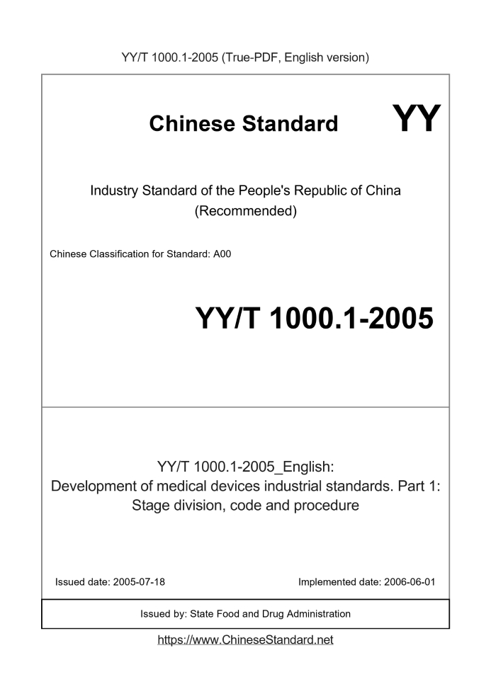 Delivery: <= 3 days. True-PDF full-copy in English will be manually translated and delivered via email. YY/T 1000.1-2005: Development of medical devices industrial standards. Part 1: Stage division, code and procedure Status: Valid
