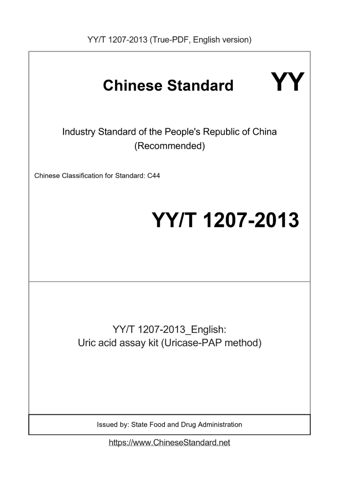 Delivery: <= 3 days. True-PDF full-copy in English will be manually translated and delivered via email. YY/T 1207-2013: Uric acid assay kit (Uricase-PAP method) Status: Valid