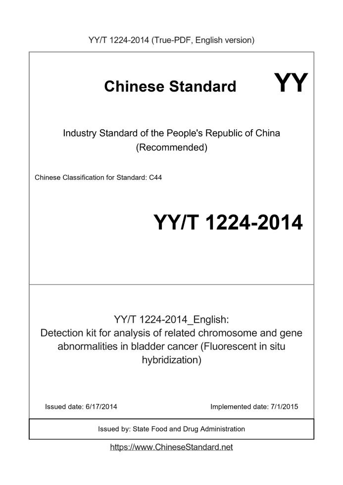 Delivery: <= 3 days. True-PDF full-copy in English will be manually translated and delivered via email. YY/T 1224-2014: Detection kit for analysis of related chromosome and gene abnormalities in bladder cancer (Fluorescent in situ hybridization) Status: Valid