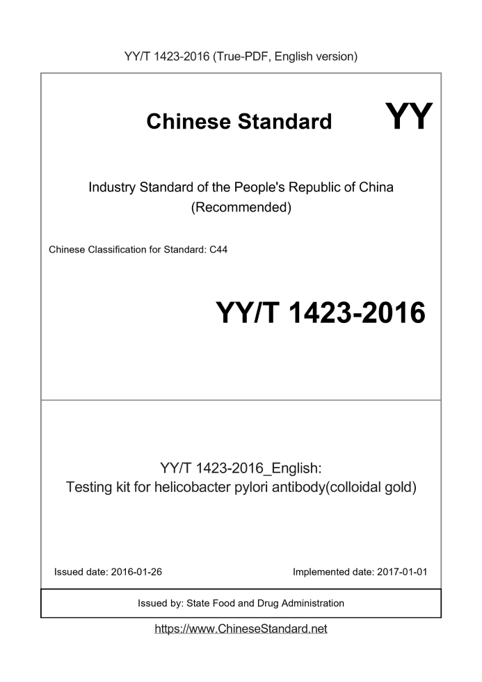 Delivery: <= 3 days. True-PDF full-copy in English will be manually translated and delivered via email. YY/T 1423-2016: Testing kit for helicobacter pylori antibody(colloidal gold) Status: Valid