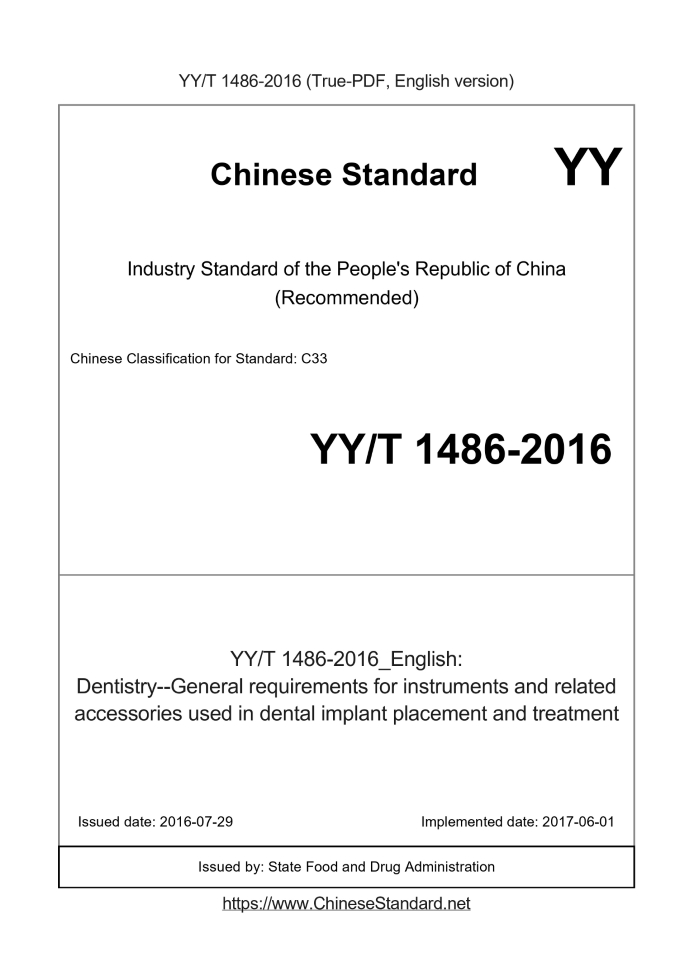 Delivery: <= 3 days. True-PDF full-copy in English will be manually translated and delivered via email. YY/T 1486-2016: Dentistry--General requirements for instruments and related accessories used in dental implant placement and treatment Status: Valid
