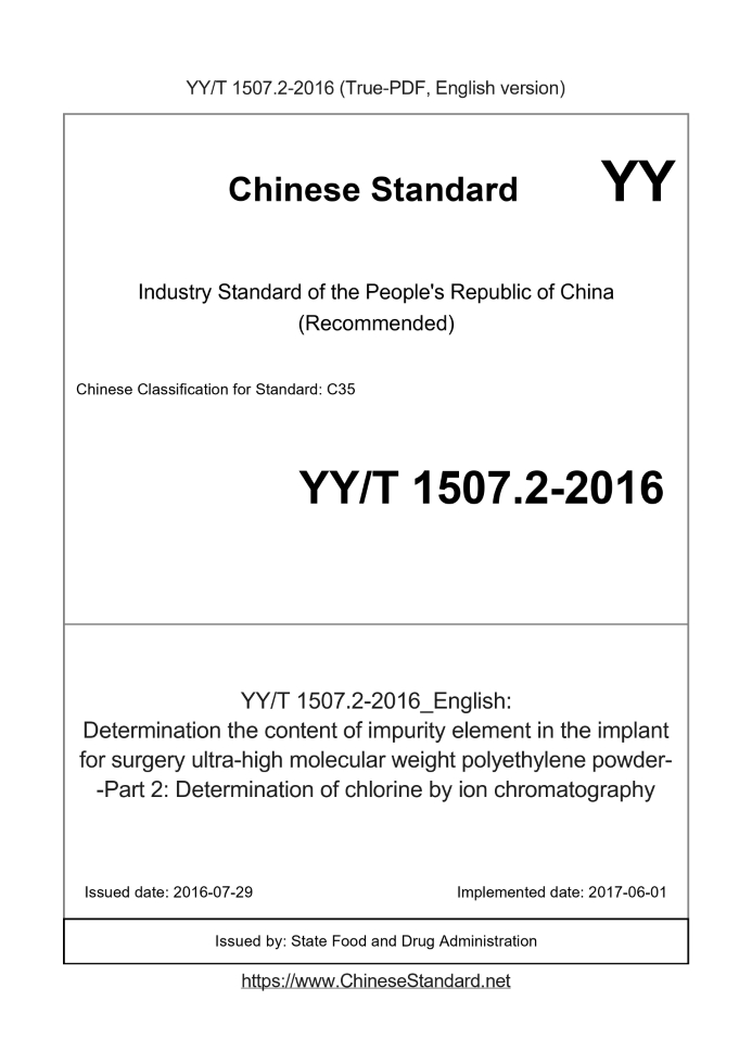 Delivery: <= 3 days. True-PDF full-copy in English will be manually translated and delivered via email. YY/T 1507.2-2016: Determination the content of impurity element in the implant for surgery ultra-high molecular weight polyethylene powder--Part 2: Determination of chlorine by ion chromatography Status: Valid