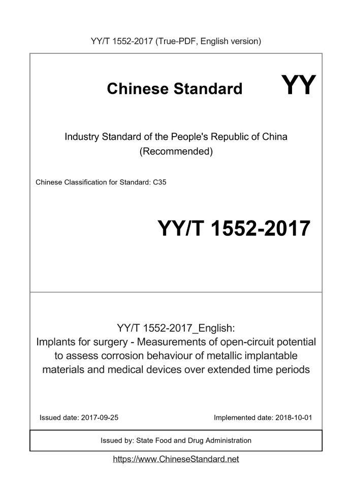 Delivery: <= 3 days. True-PDF full-copy in English will be manually translated and delivered via email. YY/T 1552-2017: Implants for surgery - Measurements of open-circuit potential to assess corrosion behaviour of metallic implantable materials and medical devices over extended time periods Status: Valid
