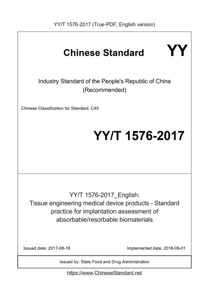 Delivery: <= 3 days. True-PDF full-copy in English will be manually translated and delivered via email. YY/T 1576-2017: Tissue engineering medical device products - Standard practice for implantation assessment of absorbable/resorbable biomaterials Status: Valid