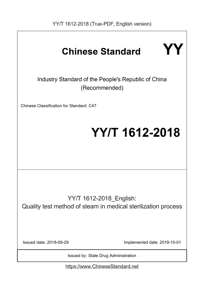 Delivery: <= 3 days. True-PDF full-copy in English will be manually translated and delivered via email. YY/T 1612-2018: Quality test method of steam in medical sterilization process Status: Valid