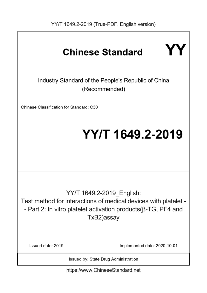Delivery: <= 3 days. True-PDF full-copy in English will be manually translated and delivered via email. YY/T 1649.2-2019: Test method for interactions of medical devices with platelet -- Part 2: In vitro platelet activation products(β-TG, PF4 and TxB2)assay Status: Valid