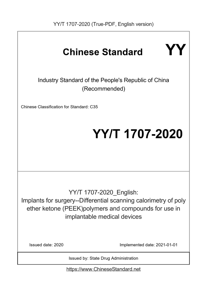 Delivery: <= 3 days. True-PDF full-copy in English will be manually translated and delivered via email. YY/T 1707-2020: Implants for surgery--Differential scanning calorimetry of poly ether ketone (PEEK)polymers and compounds for use in implantable medical devices Status: Valid