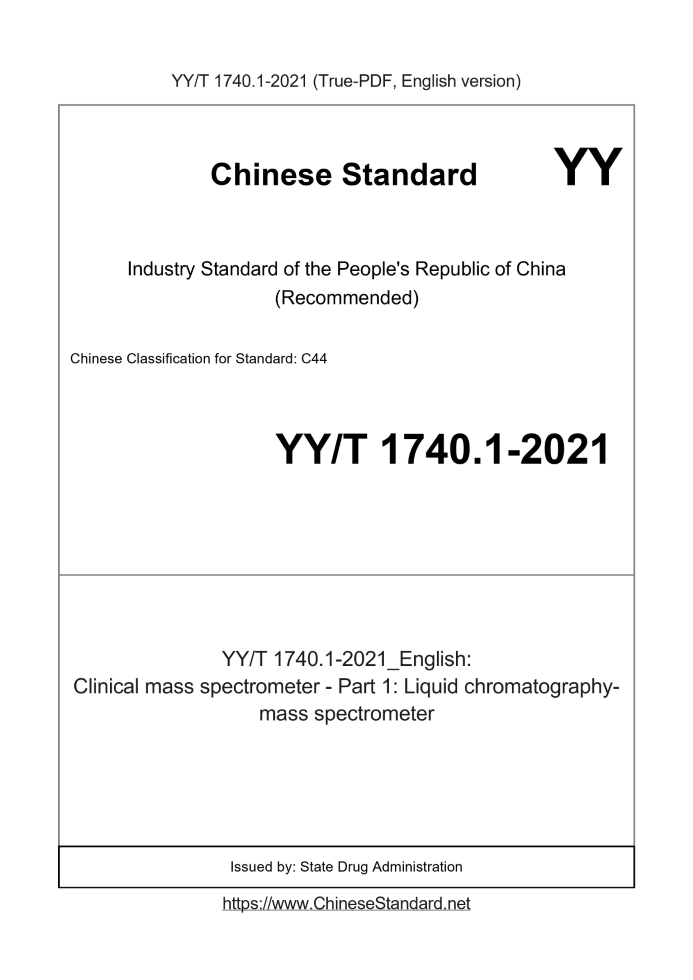 Delivery: <= 3 days. True-PDF full-copy in English will be manually translated and delivered via email. YY/T 1740.1-2021: Clinical mass spectrometer - Part 1: Liquid chromatography-mass spectrometer Status: Valid
