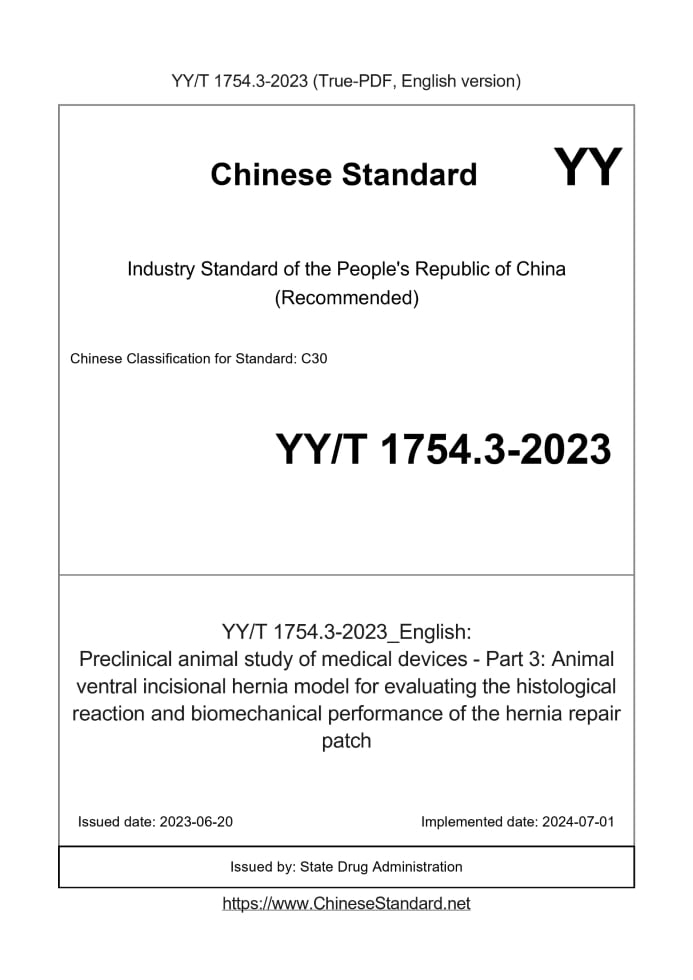 Basic dataStandard ID: YY/T 1754.3-2023 (YY/T1754.3-2023)Description (Translated English): Preclinical animal study of medical devices - Part 3: Animal ventral incisional hernia model for evaluating the histological reaction and biomechanical performance of the hernia repair patch Sector / Industry: Medical Device & Pharmaceutical Industry Standard (Recommended) Classification of Chinese Standard: C30 Classification of International Standard: 11.040.01 Word Count Estimation: 12,140 Date of Issue: 2023-06-20 Date of Implementation: 2024-07-01 Issuing agency(ies): State Drug Administration Summary: This standard specifies the test and evaluation methods for the histological response and biomechanical properties of the intra-abdominal patch. This standard is applicable to the preclinical animal test research of intraperitoneal mesh. YY/T 1754.3-2023: Preclinical animal study of medical devices - Part 3: Animal ventral incisional hernia model for evaluating the histological reaction and biomechanical performance of the hernia repair patch---This is a DRAFT version for illustration, not a final translation. Full copy of true-PDF in English version (including equations, symbols, images, flow-chart, tables, and figures etc.) will be manually/carefully translated upon your order. ICS 11.040.01 CCSC30 Pharmaceutical Industry Standards of the People's Republic of China Medical Device Preclinical Animal Studies Part 3. Used to evaluate the histological response and biomechanics of the patch Performance of the Animal Abdominal Wall Incisional Hernia Model Published on 2023-06-20 2024-07-01 Implementation Released by the State Drug Administration ForewordThis document complies with the provisions of GB/T 1.1-2020 "Standardization Work Guidelines Part 1.Structure and Drafting Rules of Standardization Documents" Drafting. This document is Part 3 of YY/T 1754 "Preclinical Animal Studies of Medical Devices". YY/T 1754 has released the following parts. ---Part 1.General requirements; ---Part 2.Induced diabetic rat skin defect model; ---Part 3.Animal abdominal wall incisional hernia model used to evaluate the histological response and biomechanical properties of the patch. Please note that some content in this document may be subject to patents. The publisher of this document assumes no responsibility for identifying patents. This document is proposed by the National Medical Products Administration. This document is under the jurisdiction of the National Standardization Technical Committee for Biological Evaluation of Medical Devices (SAC/TC248). This document was drafted by. Shandong Institute of Medical Device and Drug Packaging Inspection, Shanghai Changzheng Hospital, University of Shanghai for Science and Technology, Jiangsu Kebiao MEDICAL TESTING LIMITED. The main drafters of this document. Liu Chenghu, Hou Li, Zhang Jian, Sun Wenquan, Zhang Qi, Lin Zhenhua, Zhou Yangfei, and Zhu Fuyu.IntroductionYY/T 1754 aims to establish specific test methods for preclinical animal research on medical devices and is intended to consist of three parts. ---Part 1.General requirements. The purpose is to provide general requirements for preclinical animal studies of medical devices. ---Part 2.Induced skin defect model in diabetic rats. The purpose is to provide the structure of skin defect model in induced diabetic rats. construction method. ---Part 3.Animal abdominal wall incisional hernia model used to evaluate the histological response and biomechanical properties of the patch. The purpose is to give Testing and evaluation methods for the histological response and biomechanical properties of intra-abdominal patches. Medical Device Preclinical Animal Studies Part 3. Used to evaluate the histological response and biomechanics of the patch Performance of the Animal Abdominal Wall Incisional Hernia Model1 ScopeThis document describes methods for testing and evaluating the histological response and biomechanical properties of intra-abdominal prostheses. This document is applicable to preclinical animal testing studies of intra-abdominal mesh.2 Normative reference documentsThe contents of the following documents constitute essential provisions of this document through normative references in the text. Among them, the dated quotations For undated referenced documents, only the version corresponding to that date applies to this document; for undated referenced documents, the latest version (including all amendments) applies to this document. GB/T 16886.2 Biological evaluation of medical devices Part 2.Animal welfare requirements3 Terms and definitionsThe terms and definitions defined in GB/T 16886.2 and the following apply to this document. 3.1 hernia The internal organs or tissues leave their normal anatomical parts and enter another place through weak points, defects or pores formed by nature or acquired. parts. 3.2 incisional hernia Hernia at the site of surgical incision. Note. Generally seen after abdominal surgery, the deep fascial layer is split or not healed, causing the internal organs or tissues to protrude into the normal abdominal wall under the action of intra-abdominal pressure. outside the layer plane.4 animal choicesExperimental animals of qualified quality should be used. It is advisable to fully consider the anatomical structure of the abdominal wall and the degree of neoperitonealization between animals and humans. of comparability. It is recommended to use healthy non-pregnant experimental pigs, whose weight is generally not less than 40kg. If other species of animals are selected, their suitability should be Be explained. The number of animals should be selected based on factors such as the purpose of the experiment, design type, evaluation indicators and accuracy of evaluation methods, as well as statistical factors. Let’s consider it comprehensively. It is recommended that the animal sample size of the test sample group and the control sample group that completes the effective test at the final obs