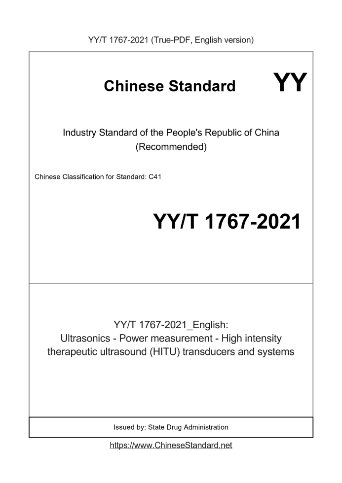 Delivery: <= 7 days. True-PDF full-copy in English will be manually translated and delivered via email. YY/T 1767-2021: Ultrasonics - Power measurement - High intensity therapeutic ultrasound (HITU) transducers and systems Status: Valid