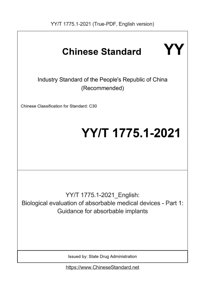 Delivery: <= 3 days. True-PDF full-copy in English will be manually translated and delivered via email. YY/T 1775.1-2021: Biological evaluation of absorbable medical devices - Part 1: Guidance for absorbable implants Status: Valid