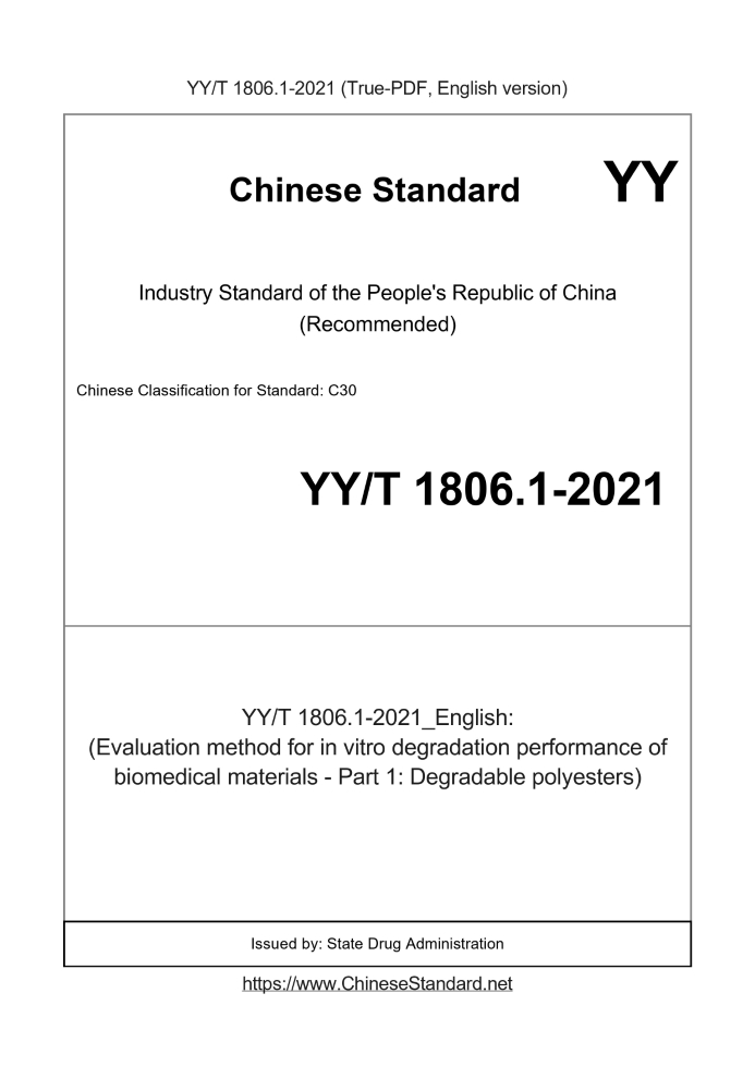 Delivery: <= 3 days. True-PDF full-copy in English will be manually translated and delivered via email. YY/T 1806.1-2021: (Evaluation method for in vitro degradation performance of biomedical materials - Part 1: Degradable polyesters) Status: Valid