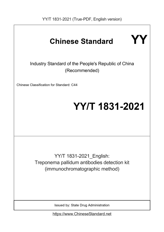 Delivery: <= 3 days. True-PDF full-copy in English will be manually translated and delivered via email. YY/T 1831-2021: Treponema pallidum antibodies detection kit (immunochromatographic method) Status: Valid