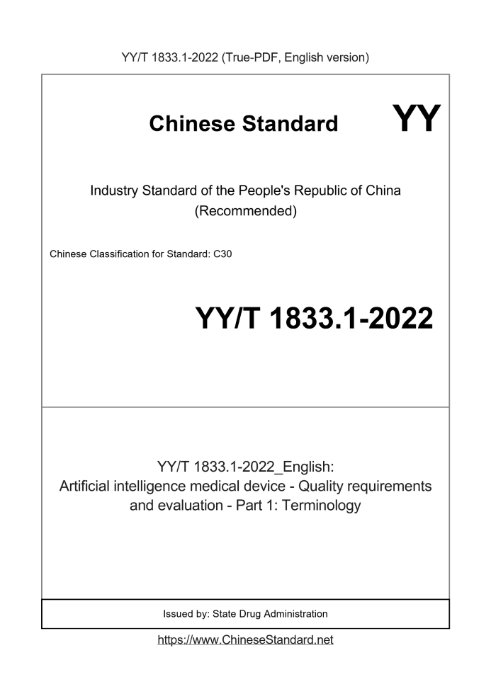 Delivery: <= 6 days. True-PDF full-copy in English will be manually translated and delivered via email. YY/T 1833.1-2022: Artificial intelligence medical device - Quality requirements and evaluation - Part 1: Terminology Status: Valid
