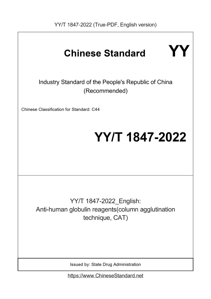 Delivery: <= 3 days. True-PDF full-copy in English will be manually translated and delivered via email. YY/T 1847-2022: Anti-human globulin reagents(column agglutination technique, CAT) Status: Valid