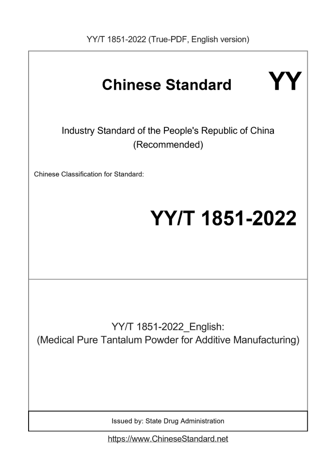 Delivery: <= 3 days. True-PDF full-copy in English will be manually translated and delivered via email. YY/T 1851-2022: (Medical Pure Tantalum Powder for Additive Manufacturing) Status: Valid