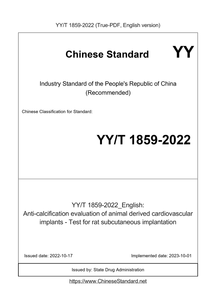 Delivery: <= 3 days. True-PDF full-copy in English will be manually translated and delivered via email. YY/T 1859-2022: Anti-calcification evaluation of animal derived cardiovascular implants - Test for rat subcutaneous implantation Status: Valid