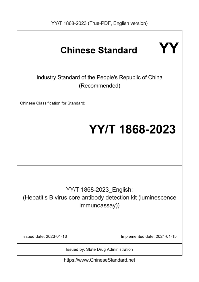 Delivery: <= 3 days. True-PDF full-copy in English will be manually translated and delivered via email. YY/T 1868-2023: (Hepatitis B virus core antibody detection kit (luminescence immunoassay)) Status: Valid
