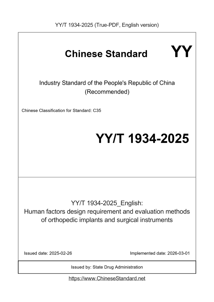 Delivery: <= 4 days. True-PDF full-copy in English will be manually translated and delivered via email. YY/T 1934-2025: Human factors design requirement and evaluation methods of orthopedic implants and surgical instruments Status: Valid