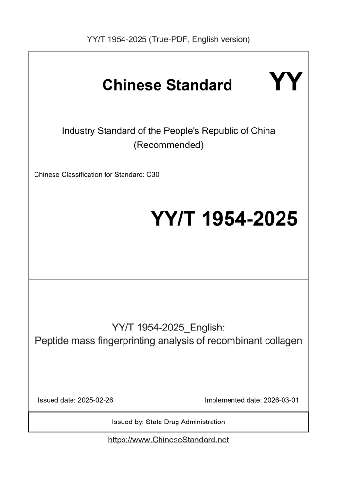 Delivery: <= 3 days. True-PDF full-copy in English will be manually translated and delivered via email. YY/T 1954-2025: Peptide mass fingerprinting analysis of recombinant collagen Status: Valid