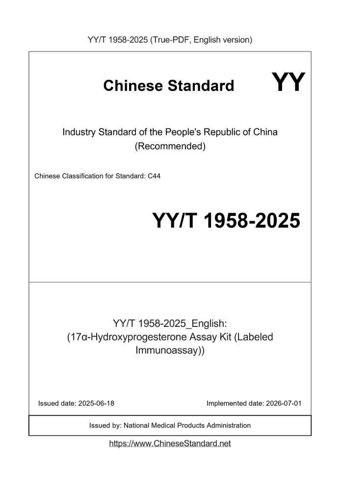 Basic dataStandard ID: YY/T 1958-2025 (YY/T1958-2025)Description (Translated English): (17��-Hydroxyprogesterone Assay Kit (Labeled Immunoassay)) Sector / Industry: Medical Device & Pharmaceutical Industry Standard (Recommended) Classification of Chinese Standard: C44 Classification of International Standard: 11.100.10 Date of Issue: 2025-06-18 Date of Implementation: 2026-07-01 Issuing agency(ies): National Medical Products Administration Tips & Frequently Asked Questions:Question 1: How long will the true-PDF of YY/T 1958-2025_English be delivered?Answer: Upon your order, we will start to translate YY/T 1958-2025_English as soon as possible, and keep you informed of the progress. The lead time is typically 1 ~ 3 working days. The lengthier the document the longer the lead time.Question 2: Can I share the purchased PDF of YY/T 1958-2025_English with my colleagues?Answer: Yes. The purchased PDF of YY/T 1958-2025_English will be deemed to be sold to your employer/organization who actually pays for it, including your colleagues and your employer's intranet.Question 3: Does the price include tax/VAT?Answer: Yes. Our tax invoice, downloaded/delivered in 9 seconds, includes all tax/VAT and complies with 100+ countries' tax regulations (tax exempted in 100+ countries) -- See Avoidance of Double Taxation Agreements (DTAs): List of DTAs signed between Singapore and 100+ countriesQuestion 4: Do you accept my currency other than USD?Answer: Yes. If you need your currency to be printed on the invoice, please write an email to Sales@ChineseStandard.net. In 2 working-hours, we will create a special link for you to pay in any currencies. Otherwise, follow the normal steps: Add to Cart -- Checkout -- Select your currency to pay. |