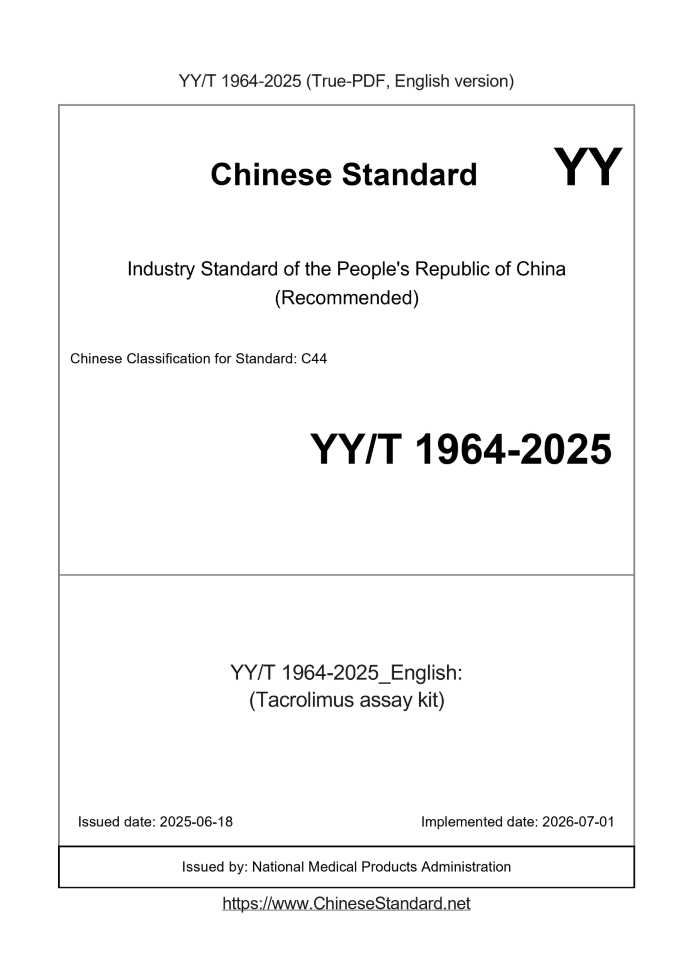Basic dataStandard ID: YY/T 1964-2025 (YY/T1964-2025)Description (Translated English): (Tacrolimus assay kit) Sector / Industry: Medical Device & Pharmaceutical Industry Standard (Recommended) Classification of Chinese Standard: C44 Classification of International Standard: 11.100.10 Date of Issue: 2025-06-18 Date of Implementation: 2026-07-01 Issuing agency(ies): National Medical Products Administration Tips & Frequently Asked Questions:Question 1: How long will the true-PDF of YY/T 1964-2025_English be delivered?Answer: Upon your order, we will start to translate YY/T 1964-2025_English as soon as possible, and keep you informed of the progress. The lead time is typically 1 ~ 3 working days. The lengthier the document the longer the lead time.Question 2: Can I share the purchased PDF of YY/T 1964-2025_English with my colleagues?Answer: Yes. The purchased PDF of YY/T 1964-2025_English will be deemed to be sold to your employer/organization who actually pays for it, including your colleagues and your employer's intranet.Question 3: Does the price include tax/VAT?Answer: Yes. Our tax invoice, downloaded/delivered in 9 seconds, includes all tax/VAT and complies with 100+ countries' tax regulations (tax exempted in 100+ countries) -- See Avoidance of Double Taxation Agreements (DTAs): List of DTAs signed between Singapore and 100+ countriesQuestion 4: Do you accept my currency other than USD?Answer: Yes. If you need your currency to be printed on the invoice, please write an email to Sales@ChineseStandard.net. In 2 working-hours, we will create a special link for you to pay in any currencies. Otherwise, follow the normal steps: Add to Cart -- Checkout -- Select your currency to pay. |