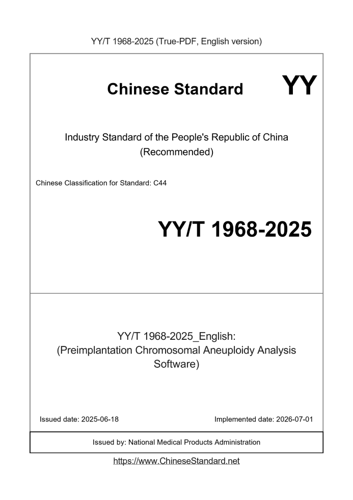 Basic dataStandard ID: YY/T 1968-2025 (YY/T1968-2025)Description (Translated English): (Preimplantation Chromosomal Aneuploidy Analysis Software) Sector / Industry: Medical Device & Pharmaceutical Industry Standard (Recommended) Classification of Chinese Standard: C44 Classification of International Standard: 110 Date of Issue: 2025-06-18 Date of Implementation: 2026-07-01 Issuing agency(ies): National Medical Products Administration Tips & Frequently Asked Questions:Question 1: How long will the true-PDF of YY/T 1968-2025_English be delivered?Answer: Upon your order, we will start to translate YY/T 1968-2025_English as soon as possible, and keep you informed of the progress. The lead time is typically 1 ~ 3 working days. The lengthier the document the longer the lead time.Question 2: Can I share the purchased PDF of YY/T 1968-2025_English with my colleagues?Answer: Yes. The purchased PDF of YY/T 1968-2025_English will be deemed to be sold to your employer/organization who actually pays for it, including your colleagues and your employer's intranet.Question 3: Does the price include tax/VAT?Answer: Yes. Our tax invoice, downloaded/delivered in 9 seconds, includes all tax/VAT and complies with 100+ countries' tax regulations (tax exempted in 100+ countries) -- See Avoidance of Double Taxation Agreements (DTAs): List of DTAs signed between Singapore and 100+ countriesQuestion 4: Do you accept my currency other than USD?Answer: Yes. If you need your currency to be printed on the invoice, please write an email to Sales@ChineseStandard.net. In 2 working-hours, we will create a special link for you to pay in any currencies. Otherwise, follow the normal steps: Add to Cart -- Checkout -- Select your currency to pay. |