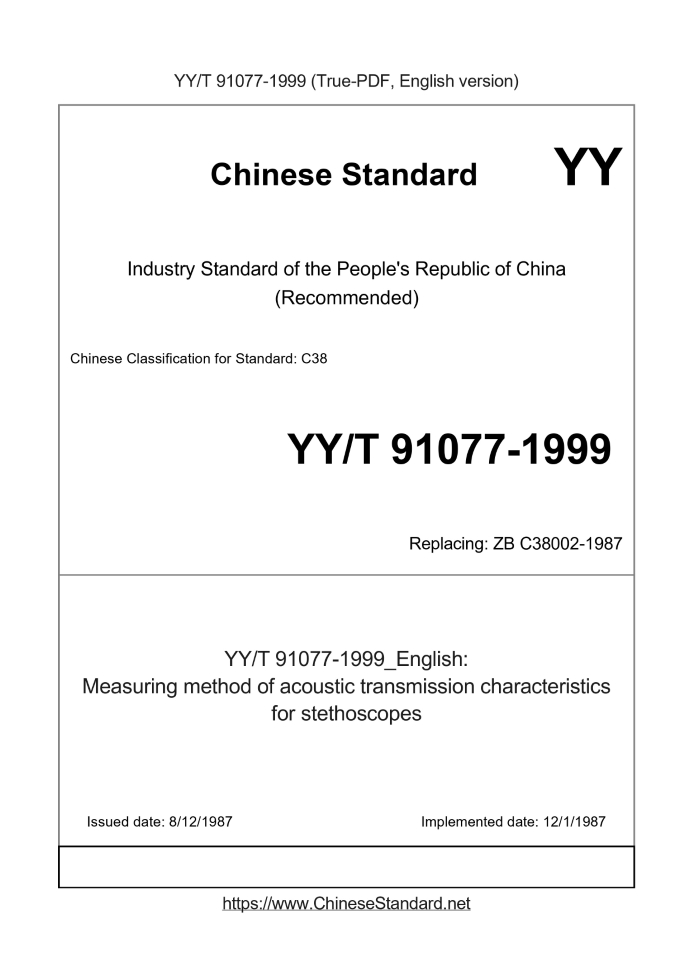 Delivery: <= 3 days. True-PDF full-copy in English will be manually translated and delivered via email. YY/T 91077-1999: Measuring method of acoustic transmission characteristics for stethoscopes Status: Obsolete