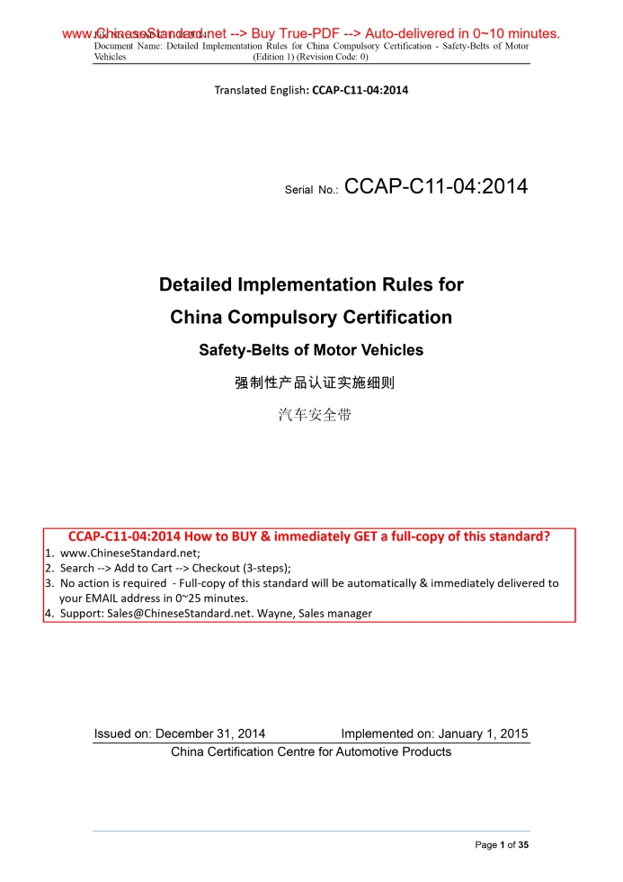 CCAP-C11-04-2014: China Compulsory Certification Implementation Detailed-Rules - Motor vehicle safety-belts Delivery: 9 seconds. True-PDF full-copy in English & invoice will be downloaded + auto-delivered via email. See step-by-step procedure