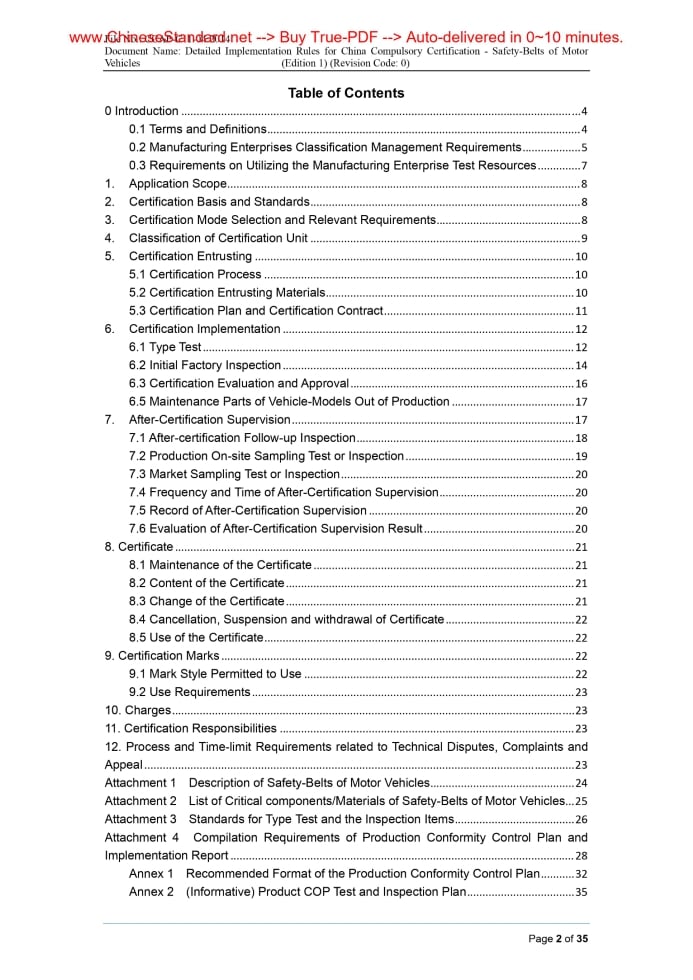Similar standardsCCAP-C11-04-2014: China Compulsory Certification Implementation Detailed-Rules - Motor vehicle safety-belts---This is an excerpt. Full copy of true-PDF in English version (including equations, symbols, images, flow-chart, tables, and figures etc.), auto-downloaded/delivered in 9 seconds, can be purchased online: https://www.ChineseStandard.net/PDF.aspx/CCAP-C11-04-2014 Document Name. Detailed Implementation Rules for China Compulsory Certification - Safety-Belts of Motor Vehicles (Edition 1) (Revision Code. 0) Serial No.. CCAP-C11-04.2014 Detailed Implementation Rules for China Compulsory Certification Safety-Belts of Motor Vehicles Issued on: DECEMBER 31, 2014 Implemented on: JANUARY 1, 2015 China Certification Centre for Automotive Products Document Name. Detailed Implementation Rules for China Compulsory Certification - Safety-Belts of Motor Vehicles (Edition 1) (Revision Code. 0) Table of Contents0 Introduction... 4 0.1 Terms and Definitions... 4 0.2 Manufacturing Enterprises Classification Management Requirements... 5 0.3 Requirements on Utilizing the Manufacturing Enterprise Test Resources... 7 1.Application Scope... 8 2.Certification Basis and Standards... 8 3.Certification Mode Selection and Relevant Requirements... 8 4.Classification of Certification Unit... 9 5.Certification Entrusting... 10 5.1 Certification Process... 10 5.2 Certification Entrusting Materials... 10 5.3 Certification Plan and Certification Contract... 11 6.Certification Implementation... 12 6.1 Type Test... 12 6.2 Initial Factory Inspection... 14 6.3 Certification Evaluation and Approval... 16 6.5 Maintenance Parts of Vehicle-Models Out of Production... 17 7.After-Certification Supervision... 17 7.1 After-certification Follow-up Inspection... 18 7.2 Production On-site Sampling Test or Inspection... 19 7.3 Market Sampling Test or Inspection... 20 7.4 Frequency and Time of After-Certification Supervision... 20 7.5 Record of After-Certification Supervision... 20 7.6 Evaluation of After-Certification Supervision Result... 20 8.Certificate... 21 8.1 Maintenance of the Certificate... 21 8.2 Content of the Certificate... 21 8.3 Change of the Certificate... 21 8.4 Cancellation, Suspension and withdrawal of Certificate... 22 8.5 Use of the Certificate... 22 9.Certification Marks... 22 9.1 Mark Style Permitted to Use... 22 9.2 Use Requirements... 23 10.Charges... 23 11.Certification Responsibilities... 23 12.Process and Time-limit Requirements related to Technical Disputes, Complaints and Appeal... 23 Attachment 1 Description of Safety-Belts of Motor Vehicles... 24 Attachment 2 List of Critical components/Materials of Safety-Belts of Motor Vehicles... 25 Attachment 3 Standards for Type Test and the Inspection Items... 26 Attachment 4 Compilation Requirements of Production Conformity Control Plan and Implementation Report... 28 Annex 1 Recommended Format of the Production Conformity Control Plan... 32 Annex 2 (Informative) Product COP Test and Inspection Plan... 35 Document Name. Detailed Implementation Rules for China Compulsory Certification - Safety-Belts of Motor Vehicles (Edition 1) (Revision Code. 0) Preface This Detailed-Rules is formulated and issued by China Certification Centre for Automotive Products (CCAP) according to China Compulsory Certification — Safety-Belt of Motor Vehicle (CNCA-C11-04.2014). Drafting organization. China Certification Centre for Automotive Products Document Name. Detailed Implementation Rules for China Compulsory Certification - Safety-Belts of Motor Vehicles (Edition 1) (Revision Code. 0)0 IntroductionIn order to ensure the standardization and effectiveness of compulsory certification, “Detailed Implementation Rules for China Compulsory Certification — Safety-Belts for Motor Vehicles” is formulated according to “Compulsory Product Certification Implementation Rules - Car Seat Belts” (CNCA-C11- 04.2014) (hereinafter refers to as the Implementation Rules) and CNCA Compulsory Product General Implementation Rules, including “Compulsory Product Certification Implementation Rules - Manufacturing Enterprise Classification Management, Certification Mode Selection and Determination” (CNCA-00C-003), “Compulsory Product Certification Implementation Rules – Utilization of Manufacturing Enterprise Test Resources and Other Certification Results” (CNCA-00C-004), “Compulsory Product Certification Implementation Rules – Factory Quality Assurance Capability Requirements” (CNCA-00C-005), and “Compulsory Product Certification Implementation Rules - Factory Inspection General Requirements” (CNCA-00C-006) and quality manuals, procedure documents and operation instructions of China Certification Centre for Automotive Products (CCAP). It is used to support the “Implementation Rules” as a supportive document. Application scope and certification basis of this Detailed Implementation Rules [Translator note. Hereafter abbreviated as Detailed-Rules] are consistent with the provisions of “Implementation Rules”, and it changes along the CCC product catalogs and the announcements on adjustment and definition of the product certification scope released by CNCA. It will be adjusted and implemented synchronously with the “Implementation Rules”. 0.1 Terms and Definitions 0.1.1 Testing at Manufacturer’s Premises (abbreviated as TMP mode) It means that the engineers of designated laboratory use the testing equipment in the factory laboratory to conduct testing. The factory shall dispatch test personnel to provide assistance. The designated laboratory will examine, approve and issue the test report. 0.1.2 Witnessed Manufacturer’s Testing (abbreviated as WMT mode) It means that the engineer of designated laboratory witnesses the factory laboratory’s test conditions and all tests completed by using the laboratory’s equipment or according to the test plan submitted; or witnesses part of the test conditions and the test items. Test personnel of the factory la