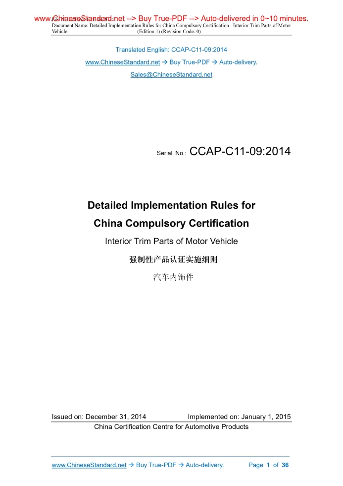 CCAP-C11-09-2014: China Compulsory Certification Implementation Detailed-Rules - vehicle interior parts Delivery: 9 seconds. True-PDF full-copy in English & invoice will be downloaded + auto-delivered via email. See step-by-step procedure