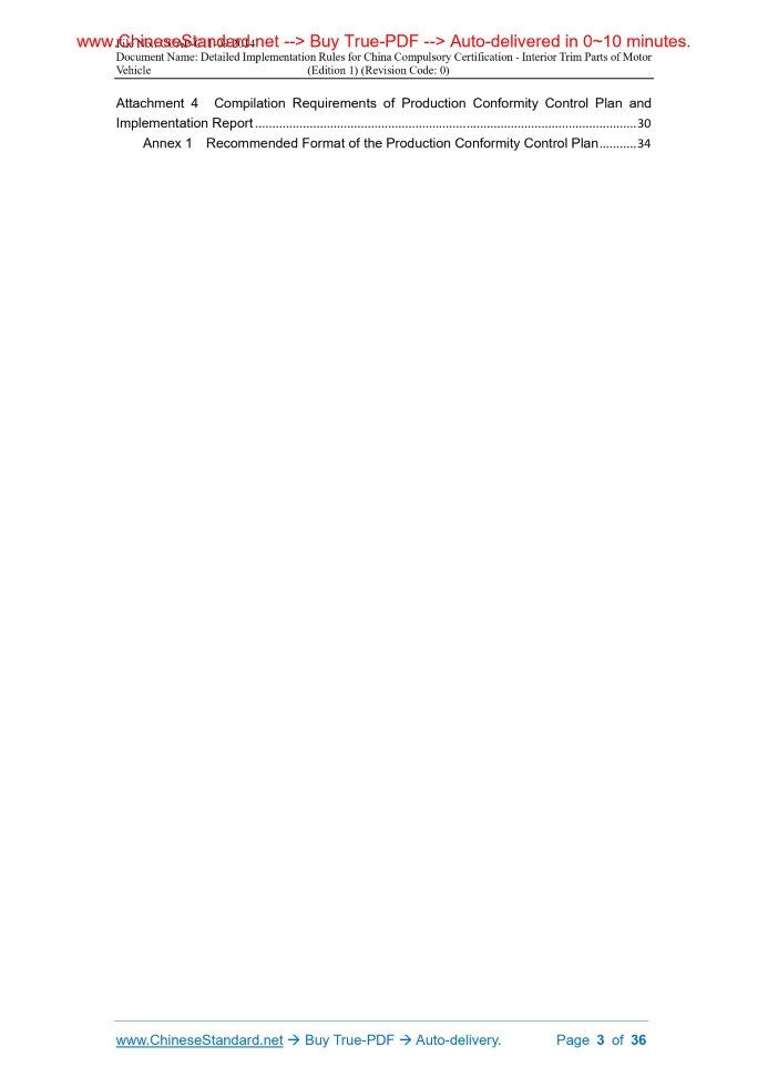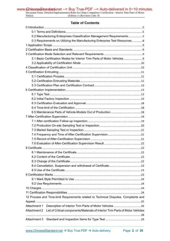 Similar standardsCCAP-C11-09-2014: China Compulsory Certification Implementation Detailed-Rules - vehicle interior parts---This is an excerpt. Full copy of true-PDF in English version (including equations, symbols, images, flow-chart, tables, and figures etc.), auto-downloaded/delivered in 9 seconds, can be purchased online: https://www.ChineseStandard.net/PDF.aspx/CCAP-C11-09-2014 Document Name. Detailed Implementation Rules for China Compulsory Certification - Interior Trim Parts of Motor Vehicle (Edition 1) (Revision Code. 0) Serial No.. CCAP-C11-09.2014 Detailed Implementation Rules for China Compulsory Certification Interior Trim Parts of Motor Vehicle Issued on: DECEMBER 31, 2014 Implemented on: JANUARY 1, 2015 China Certification Centre for Automotive Products Document Name. Detailed Implementation Rules for China Compulsory Certification - Interior Trim Parts of Motor Vehicle (Edition 1) (Revision Code. 0) Table of Contents0 Introduction... 5 0.1 Terms and Definitions... 5 0.2 Manufacturing Enterprises Classification Management Requirements... 5 0.3 Requirements on Utilizing the Manufacturing Enterprise Test Resources... 8 1 Application Scope... 9 2 Certification Basis and Standards... 9 3 Certification Mode Selection and Relevant Requirements... 9 3.1 Basic Certification Modes for Interior Trim Parts of Motor Vehicles... 9 3.2 Applicability of Certification Mode... 10 4 Classification of Certification Unit... 10 5 Certification Entrusting... 11 5.1 Certification Process... 11 5.2 Certification Entrusting Materials... 11 5.3 Certification Plan and Certification Contract... 12 6 Certification Implementation... 13 6.1 Type Test... 13 6.2 Initial Factory Inspection... 15 6.3 Certification Evaluation and Approval... 18 6.4 Time-limit of the Certification... 18 6.5 Maintenance Parts of Vehicle-Models Out of Production... 18 7 After-Certification Supervision... 19 7.1 After-certification Follow-up Inspection... 19 7.2 Production On-site Sampling Test or Inspection... 20 7.3 Market Sampling Test or Inspection... 21 7.4 Frequency and Time of After-Certification Supervision... 21 7.5 Record of After-Certification Supervision... 21 7.6 Evaluation of After-Certification Supervision Result... 22 8 Certificate... 22 8.1 Maintenance of the Certificate... 22 8.2 Content of the Certificate... 22 8.3 Change of the Certificate... 22 8.4 Cancellation, Suspension and withdrawal of Certificate... 23 8.5 Use of the Certificate... 23 9 Certification Marks... 23 9.1 Mark Style Permitted to Use... 24 9.2 Use Requirements... 24 10 Charges... 24 11 Certification Responsibilities... 24 12 Process and Time-limit Requirements related to Technical Disputes, Complaints and Appeal... 25 Attachment 1 Description of Interior Trim Parts of Motor Vehicles... 26 Attachment 2 List of Critical components/Materials of Interior Trim Parts of Motor Vehicles ... 28 Attachment 3 Standard and Inspection Items for Type Test... 29 Document Name. Detailed Implementation Rules for China Compulsory Certification - Interior Trim Parts of Motor Vehicle (Edition 1) (Revision Code. 0) Attachment 4 Compilation Requirements of Production Conformity Control Plan and Implementation Report... 30 Annex 1 Recommended Format of the Production Conformity Control Plan... 34 Document Name. Detailed Implementation Rules for China Compulsory Certification - Interior Trim Parts of Motor Vehicle (Edition 1) (Revision Code. 0)0 IntroductionIn order to ensure the standardization and effectiveness of compulsory certification, this is formulated according to “Compulsory Product Certification Implementation Rules - Interior Trim Parts for Motor Vehicle” (CNCA-C11- 09.2014) (hereinafter refers to as the Implementation Rules) and CNCA Compulsory Product General Implementation Rules, including “Compulsory Product Certification Implementation Rules - Manufacturing Enterprise Classification Management, Certification Mode Selection and Determination” (CNCA-00C-003), “Compulsory Product Certification Implementation Rules – Utilization of Manufacturing Enterprise Test Resources and Other Certification Results” (CNCA-00C-004), “Compulsory Product Certification Implementation Rules – Factory Quality Assurance Capability Requirements” (CNCA-00C-005), and “Compulsory Product Certification Implementation Rules - Factory Inspection General Requirements” (CNCA-00C-006) and quality manuals, procedure documents and operation instructions of China Certification Centre for Automotive Products (CCAP). It is used to support the “Implementation Rules” as a supportive document. Application scope and certification basis of this Detailed Rules are consistent with the provisions of “Implementation Rules”, and it changes along the CCC product catalogs and the announcements on adjustment and definition of the product certification scope released by CNCA. It will be adjusted and implemented synchronously with the “Implementation Rules”. 0.1 Terms and Definitions 0.1.1 Testing at Manufacturer’s Premises (abbreviated as TMP mode) It means that the engineers of designated laboratory use the testing equipment in the factory laboratory to conduct testing. The factory shall dispatch test personnel to provide assistance. The designated laboratory will examine, approve and issue the test report. 0.1.2 Witnessed Manufacturer’s Testing (abbreviated as WMT mode) It means that the engineer of designated laboratory witnesses the factory laboratory’s test conditions and all tests completed by using the laboratory’s equipment or according to the test plan submitted; or witnesses part of the test conditions and the test items. Test personnel of the factory laboratory shall provide the original records and draft up the test report together with the engineer of designated laboratory according to relevant provisions. The designated laboratory shall audit, approve and issue the test report. 0.2 Manufacturing Enterprises Classification Management Requirements