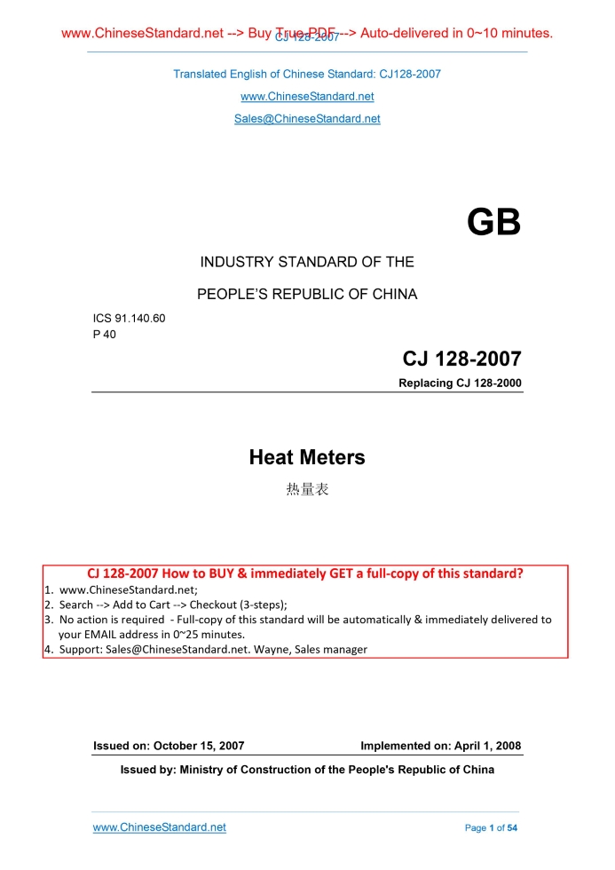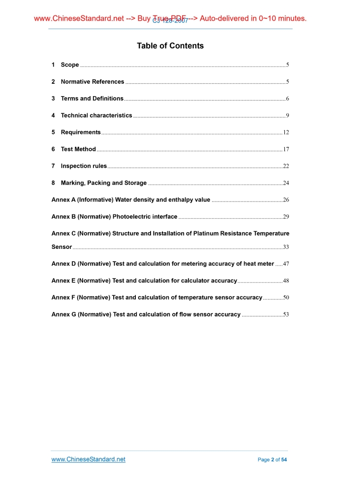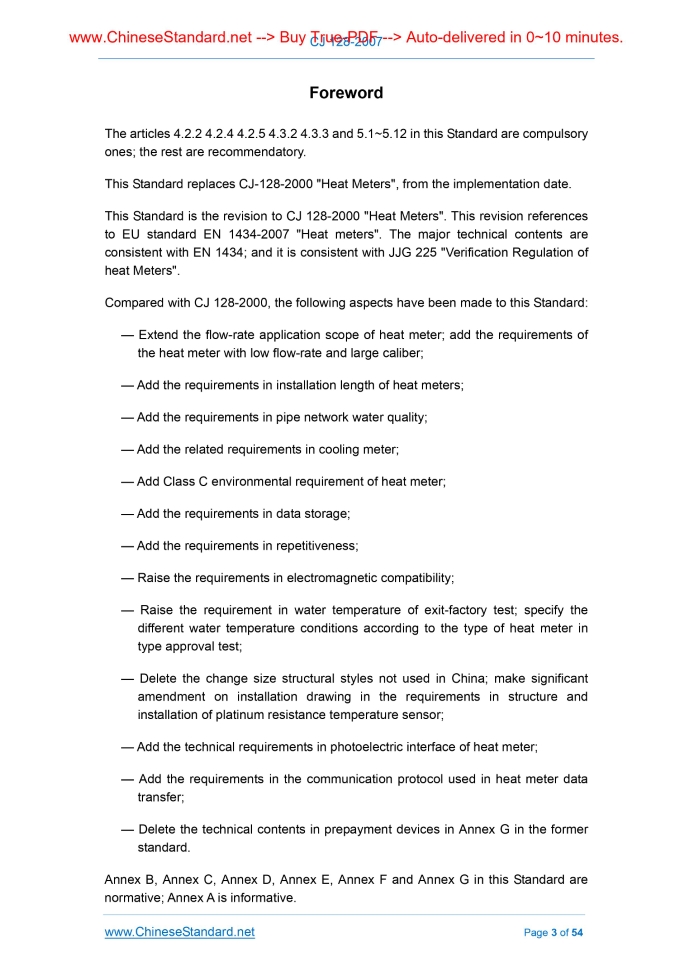 Similar standardsCJ 128-2007: Heat meters---This is an excerpt. Full copy of true-PDF in English version (including equations, symbols, images, flow-chart, tables, and figures etc.), auto-downloaded/delivered in 9 seconds, can be purchased online: https://www.ChineseStandard.net/PDF.aspx/CJ128-2007GB INDUSTRY STANDARD OF THE PEOPLE’S REPUBLIC OF CHINA ICS 91.140.60 P 40 Replacing CJ 128-2000 Heat Meters Issued on: OCTOBER 15, 2007 Implemented on: APRIL 1, 2008 Issued by. Ministry of Construction of the People's Republic of China Table of Contents1 Scope ... 5 2 Normative References ... 5 3 Terms and Definitions ... 6 4 Technical characteristics ... 9 5 Requirements ... 12 6 Test Method ... 17 7 Inspection rules ... 22 8 Marking, Packing and Storage ... 24 Annex A (Informative) Water density and enthalpy value ... 26 Annex B (Normative) Photoelectric interface ... 29 Annex C (Normative) Structure and Installation of Platinum Resistance Temperature Sensor ... 33 Annex D (Normative) Test and calculation for metering accuracy of heat meter ... 47 Annex E (Normative) Test and calculation for calculator accuracy ... 48 Annex F (Normative) Test and calculation of temperature sensor accuracy ... 50 Annex G (Normative) Test and calculation of flow sensor accuracy ... 53 Foreword The articles 4.2.2 4.2.4 4.2.5 4.3.2 4.3.3 and 5.1~5.12 in this Standard are compulsory ones; the rest are recommendatory. This Standard replaces CJ-128-2000 "Heat Meters", from the implementation date. This Standard is the revision to CJ 128-2000 "Heat Meters". This revision references to EU standard EN 1434-2007 "Heat meters". The major technical contents are consistent with EN 1434; and it is consistent with JJG 225 "Verification Regulation of heat Meters". Compared with CJ 128-2000, the following aspects have been made to this Standard. — Extend the flow-rate application scope of heat meter; add the requirements of the heat meter with low flow-rate and large caliber; — Add the requirements in installation length of heat meters; — Add the requirements in pipe network water quality; — Add the related requirements in cooling meter; — Add Class C environmental requirement of heat meter; — Add the requirements in data storage; — Add the requirements in repetitiveness; — Raise the requirements in electromagnetic compatibility; — Raise the requirement in water temperature of exit-factory test; specify the different water temperature conditions according to the type of heat meter in type approval test; — Delete the change size structural styles not used in China; make significant amendment on installation drawing in the requirements in structure and installation of platinum resistance temperature sensor; — Add the technical requirements in photoelectric interface of heat meter; — Add the requirements in the communication protocol used in heat meter data transfer; — Delete the technical contents in prepayment devices in Annex G in the former standard. Annex B, Annex C, Annex D, Annex E, Annex F and Annex G in this Standard are normative; Annex A is informative. Heat Meters1 ScopeThis Standard specifies terms and definitions, technical characteristic, requirement, test method, test rules, marking, packing, and storage of heat meters. This Standard is applicable to heat meters of which the flowing medium is water, the temperature is 2°C~150°C, and the pressure is not larger than 2.5 MPa.2 Normative ReferencesThe following normative documents contain provisions which, through reference in this text, constitute that provisions of this Standard. For dated reference, the subsequent amendments or revisions of these publications do not apply. Parties who reach an agreement based on this Standard are encouraged to investigate the possibility of applying the most recent editions of the standards indicated below. For undated references, the latest edition of the normative document referred to applies. GB 191 Packaging - Pictorial marking for handling of goods GB/T 2423.1 Environmental testing - Part 2. Test methods - Tests A. Cold GB/T 2423.2 Environmental testing - Part 2. Test methods - Tests A. Dry heat GB/T 2423.3 Environmental testing - Part 2. Test methods - Tests A. Damp heat Steady GB/T 2423.4 Environmental testing for electric and electronic products - Part 2. Test method - Test Db. Damp heat, cyclic (12h+12h cycle) GB 4208-1993 Degrees of protection provided by enclosure (IP code) GB 4706.1 Household and similar electrical appliances - Safety - Part 1. General requirements GB/T 9113.1 Integral steel pipe flanges with flat face or raised face GB/T 17626.2 Electromagnetic compatibility (EMC) - Testing and measurement techniques - Electrostatic discharge immunity test GB/T 17626.3 Electromagnetic compatibility - Testing and measurement techniques - Radiated radio-frequency electromagnetic field immunity test GB/T 17626.4 Electromagnetic compatibility - Testing and measurement techniques - Electrical fast transient/burst immunity test GB/T 17626.5 Electromagnetic compatibility - Testing and measurement techniques - Surge immunity test GB/T 17626.8 Electromagnetic compatibility (EMC) - Part 4-8. Testing and measurement techniques - Power frequency magnetic field immunity test GB/T 17626.11 Electromagnetic compatibility - Testing and measurement techniques - Voltage dips, short interruptions and voltage variations immunity tests CJJ 34 Design code of district heating network CJ/T 188-2004 Technical requirements of utility meters data transmission JB/T 9329 Basic environmental conditions and testing methods for instruments transportation and storage in the transportation3 Terms and DefinitionsThe following terms and definitions apply to this Standard. 3.1 Heat meter Meter that meters and displays the heat energy that the water-flow releases or absorbs when passing heat exchange system. 3.2 Complete heat meter Non-decomposable heat meter consisted of flow sensor, calculator and temperature sensor pair. 3.3